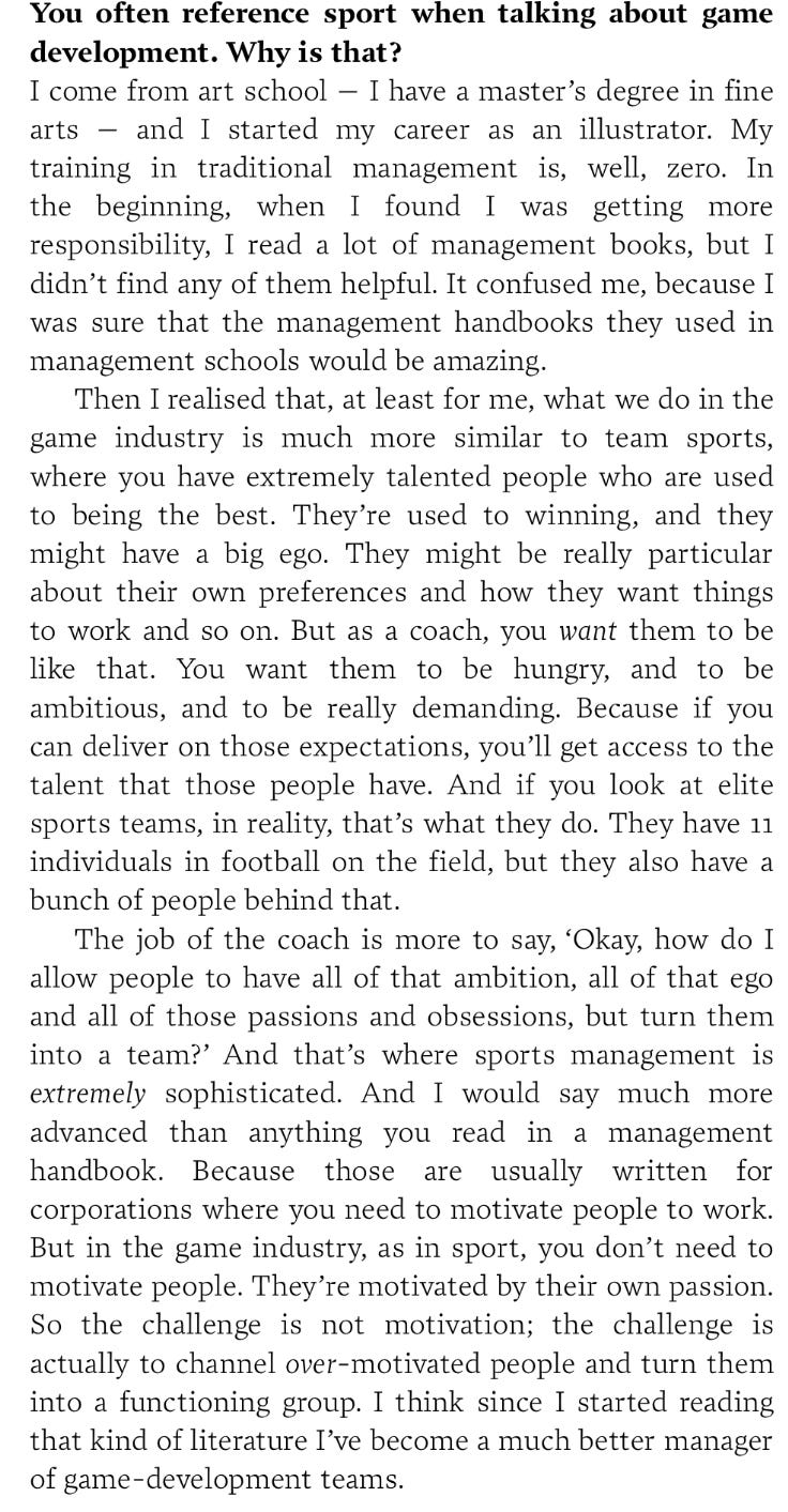 Landing in paid-subscriber inboxes tomorrow morning is a profile of David Polfeldt, the former MD of Ubisoft Massive, and author of the brilliant game-industry memoir The Dream Architects. I’ve known David for years — I met him on my first ever overseas trip for Edge, and we’ve been firm friends ever since — and while I always knew he had an unconventional view on how game teams should be run, I didn’t realise just how different it was until I interviewed him for Edge in 2019. David, I had noticed over the years, was fond of sporting references. I thought, okay, this guy just really likes sport. But in that 2019 interview I finally asked him why he did it. In response he said probably the most insightful thing I have heard in all my years interviewing people about making games.