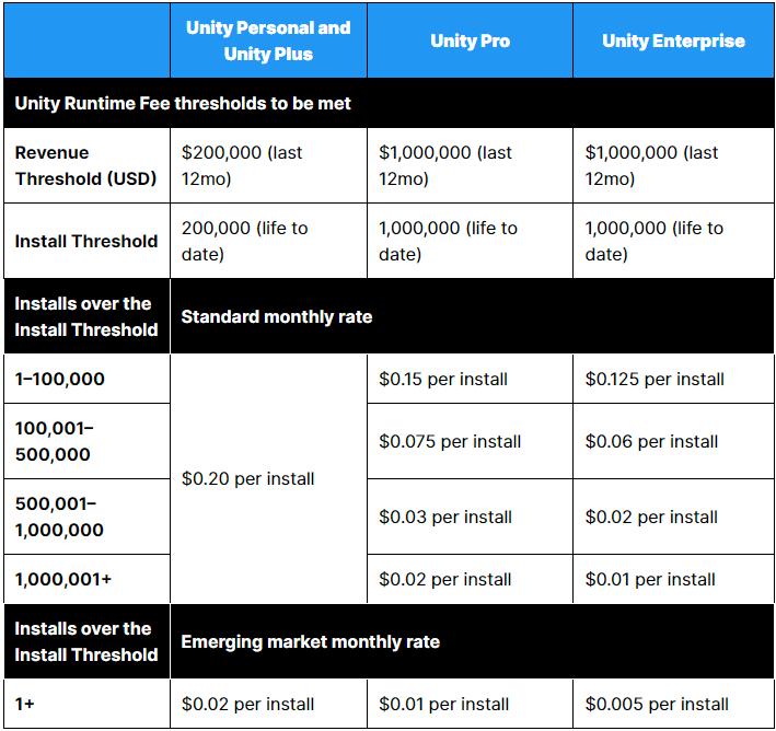 If you have somehow missed the latest news, allow me to briefly catch you up. Yesterday Unity, maker of one of the (hitherto, I guess) most popular and affordable game engines on the planet, announced a new pricing policy. From January 1 the company will charge game makers what it calls the Unity Runtime Fee: a monthly charge for every new install of the game once it passes certain $200,000 in annual revenue and 200,000 lifetime installs, payable seemingly for the entire lifetime of the product, which as far as I can tell means ‘until the heat death of the universe’. Here’s a table, pulled from Unity’s blog post announcing the move.