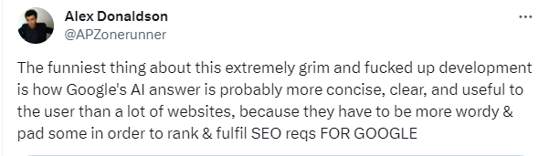Alex is right, of course. As I learned in those early SEO meetings, online media has little choice but to dance to Google’s tune, and it’s a bit rum of the company that is most to blame for the user-hostile clutter and bloat of today’s internet to suddenly go ‘hey, most search queries can be answered in a couple of sentences, let’s do that instead’. Particularly when doing so means depriving the website(s) that actually did the work your machine-learning tech is getting its information from of the traffic, and the ad revenue, that said content was specifically and solely produced to generate.