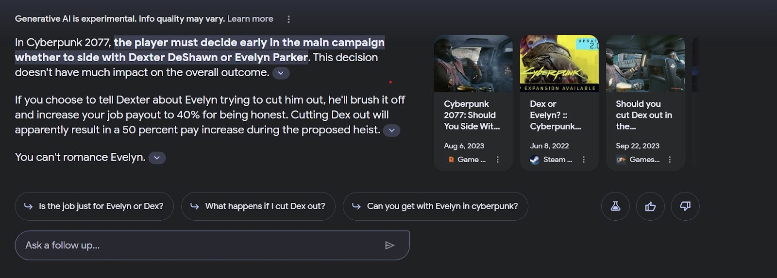 The implications of denying search traffic to websites that depend on it for revenue, I imagine, go without saying, but we’re 2,000 words deep into this thing already so we might as well get into it. This model may work for Google, and Google users, for games that are already on shelves. If someone searches for advice on Cyberpunk 2077’s Dex vs Evelyn decision in 20 years, Google’s ML models will be able to provide it. But what about the games of the future? What are you going to train the machine-learning models of tomorrow on when you’ve put all the guides teams out of work, the websites they used to write for have gone out of business, and no new ones have stepped into the void because you’ve shown there’s not a penny to be made from producing content for Google’s robot army to steal? Where’s the fucking future in that?